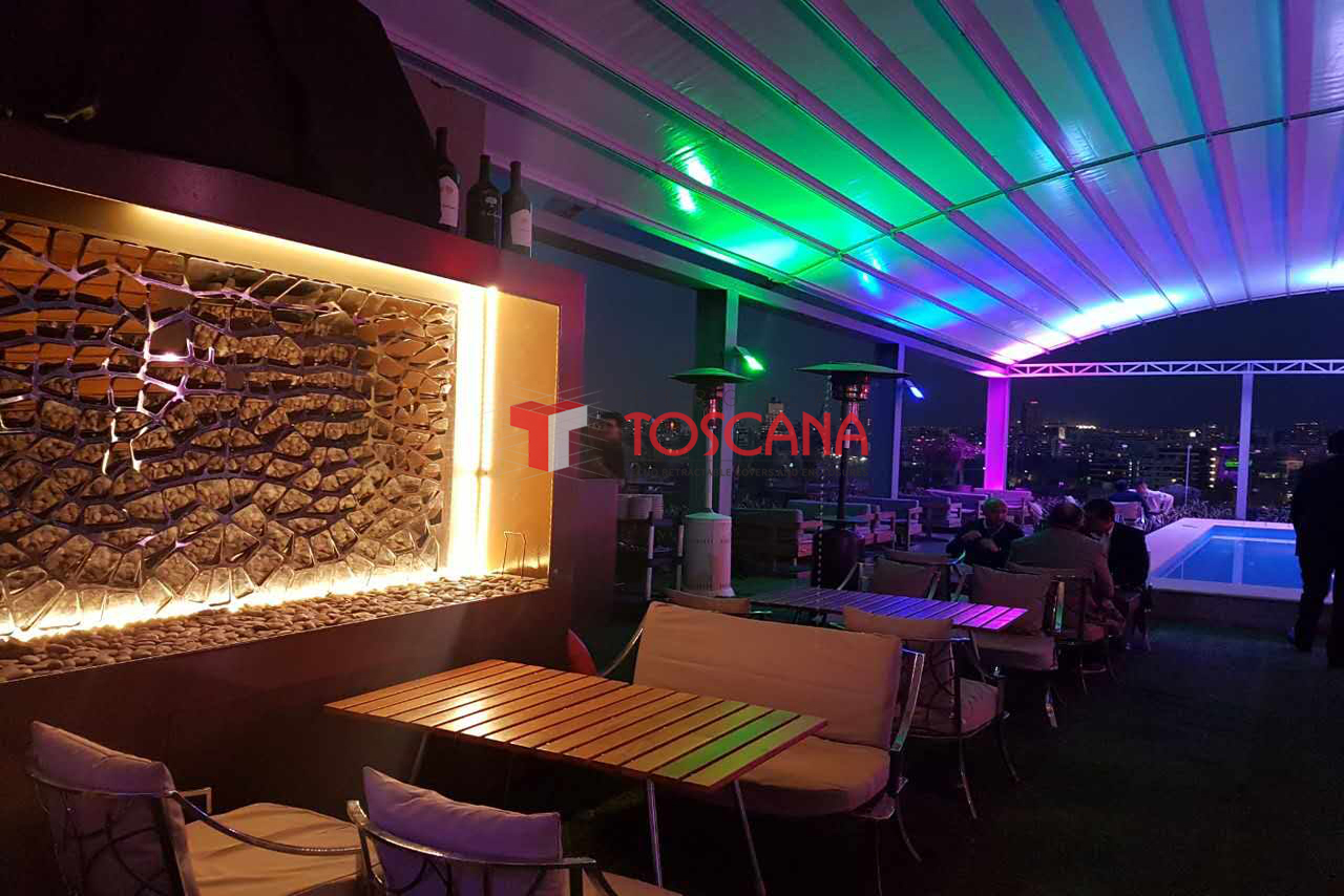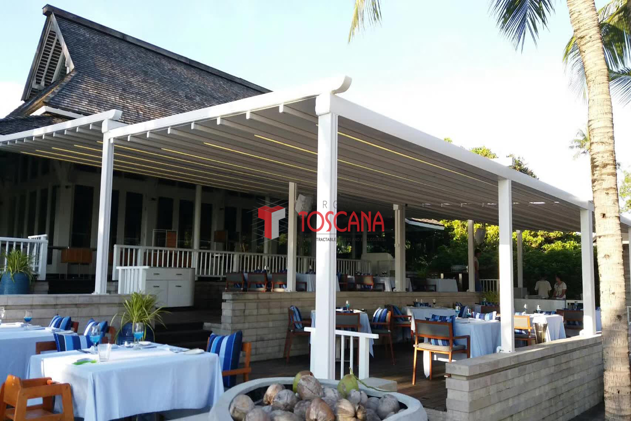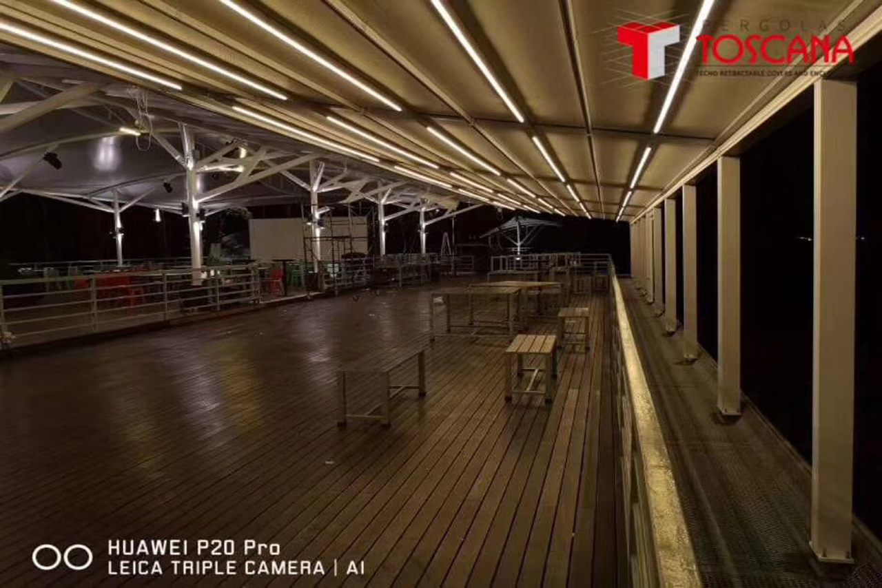 PergoTek 是一種軌道天篷和伸(shēn)縮遮陽篷的結合。布料通過特製(zhì)的電機隨鋁製軌道(dào)伸縮移動,打開時可讓客戶感受大自然的陽光與空氣,閉合後可以(yǐ)100%防水並有效遮擋陽光。產品能最低承受(shòu)50km/h的風(fēng)力。目前最大的寬度長達13.5m,外飄伸展:12m。 產品用途:酒吧街(jiē)、星級(jí)酒店、星級 餐廳、豪華別墅區等高端(duān)商業場所(suǒ);泳池、花園、露台等私人豪華住宅區;園林配套設施工程等。